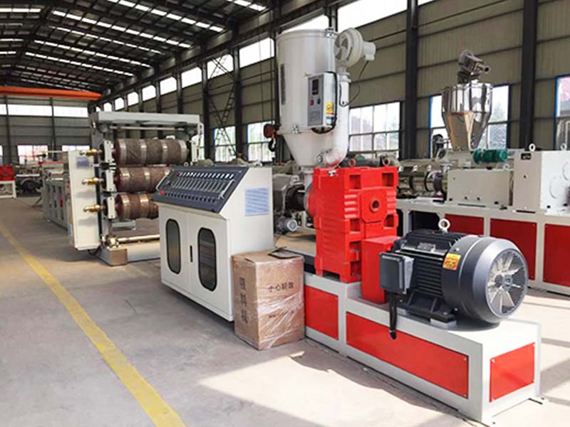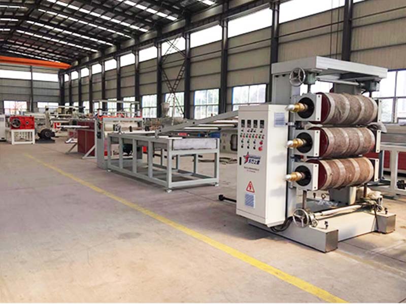 PVC透明軟門簾生產(chǎn)線:可生產(chǎn)寬度200-600毫米、厚度0.8-3毫米的PVC透明塑料片材。該設(shè)備采SJ90或SJ-120單螺桿擠出機(jī)、T型彈性??诳烧{(diào)模具、立式或斜45度三輥壓光機(jī)、三合一水溫機(jī)、不銹鋼冷卻托架裝并裝有寬幅可調(diào)切邊刀、橡膠輥牽引機(jī)、雙工位氣漲軸收卷機(jī)。所生產(chǎn)的片材表面光澤,通透無暇,柔軟,無裂縫、無異味、無氣泡、柔軟耐寒、耐磨、耐酸堿、耐腐蝕。
